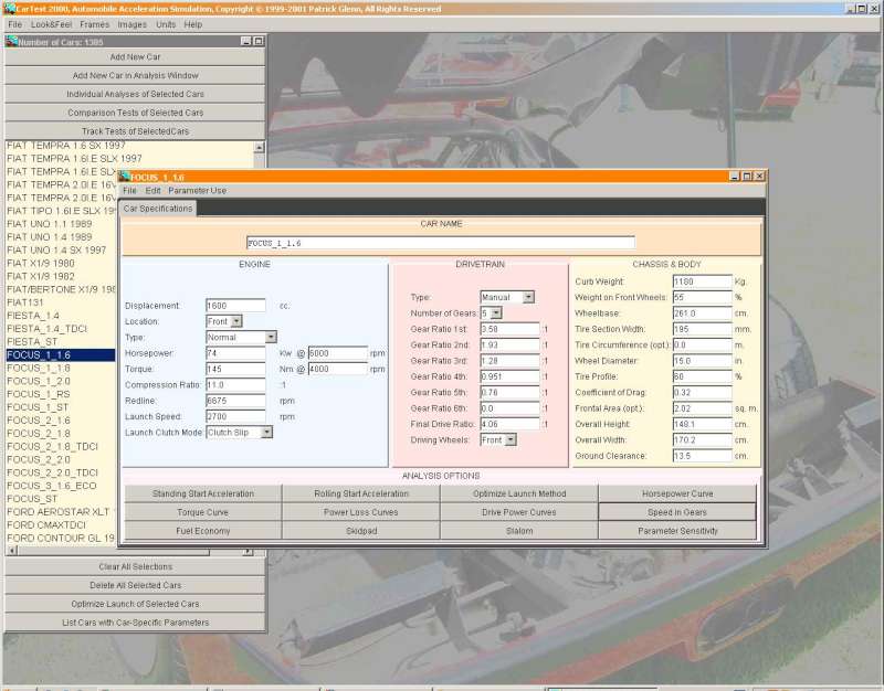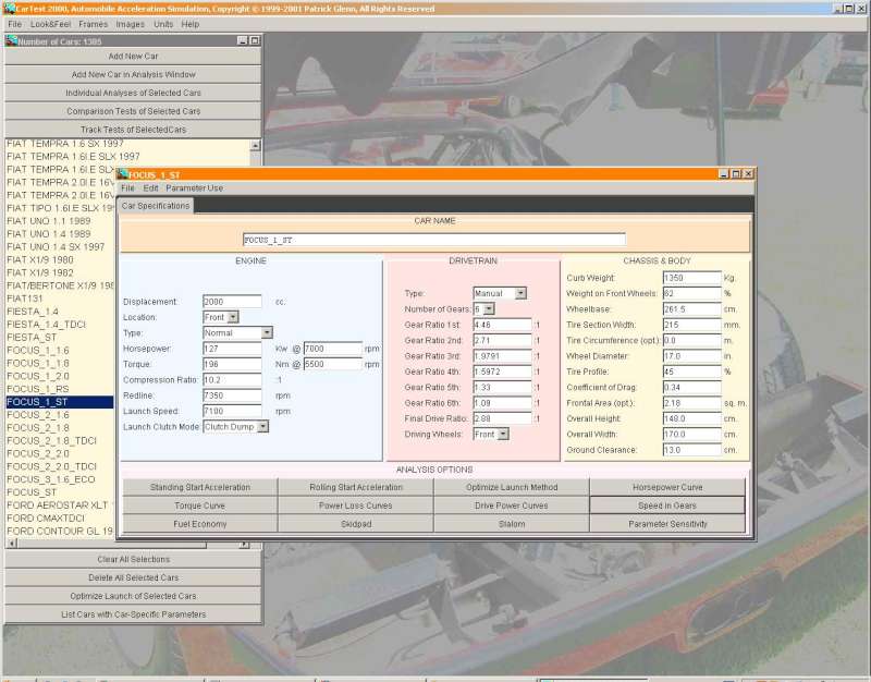 Ja som to tahal z torrentov (nazov je "Cartest 2000"). Len teda vsetky udaje k vytvoreniu noveho auta si musis zistit sam. Je to starsi problem a su tam len vybrane auta povedzme do roku 2001. Je potrebne vediet prevodove pomery, rozmery auta, charakteristiku motora. V pripade ze chces aby ti program ratal dynamicke parametre vozidla (zrychlenie, max rychlost, pruznost) tak aj krivku vykonu a koeficient odporu vzduchu, rozlozenie hmotnosti. Program ti vie zistit optimalne otacky a sposob pustenia spojky vzhladom na najlepsiu akceleraciu 0-100 a podobne dalsie somarinky, je toho vela. Pre zdatnejsich je moznost editovania specifickych parametrov, ktore tieto merania mozu ovplyvnit, teplota a vlhkost vzduchu, stupanie vozovky, tlak vzduchu v pneumatikach, protivietor, atmosfericky tlak vzduchu, cas potrebny na preradenie, valivy odpor, nabeh tlaku turba, straty diferencialov, prevodoviek, hmotnost vodica, hmotnost paliva a mnoho dalsich. Ale najvacsi problem z celeho su samozrejme prevodove pomery, bez ktorych tam auto ani nevytvoris.