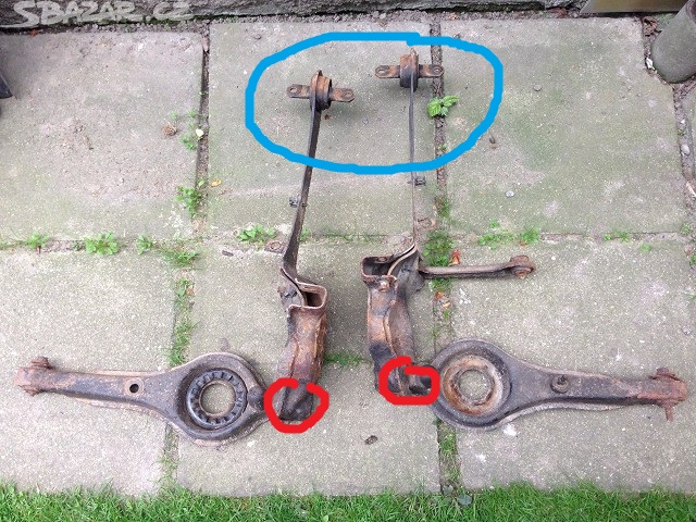 mám FoFo combi 2008 a všiml jsem si, že mi od zadní nápravy vychází při přejezdu jakékoliv nerovnosti plechové klepání. Jako by kryt výfuku mlátil o výfuk nebo o nápravu. Tak jsem byl s autem na rampě, ale výfuk i jeho krytí je naprosto v pořádku. Dokonce jsem ho na pár místech zpevnil, ale stejně to nepomohlo. Jinak při přejezdu nerovnosti vypadá náprava OK. Při kontrole silentbloku jsem přišel na dva načnuté silentbbloky na spodním rameni zadní nápravy. Viz. foto (označeny červeně) a při pohledu na foto jsem si všiml, že jsem vůbec nezkontrolovat ty silentbloky označené modře. Je možné, že to dělaji ty modře označené silentbloky, které jsem jediné nekontrolovat?