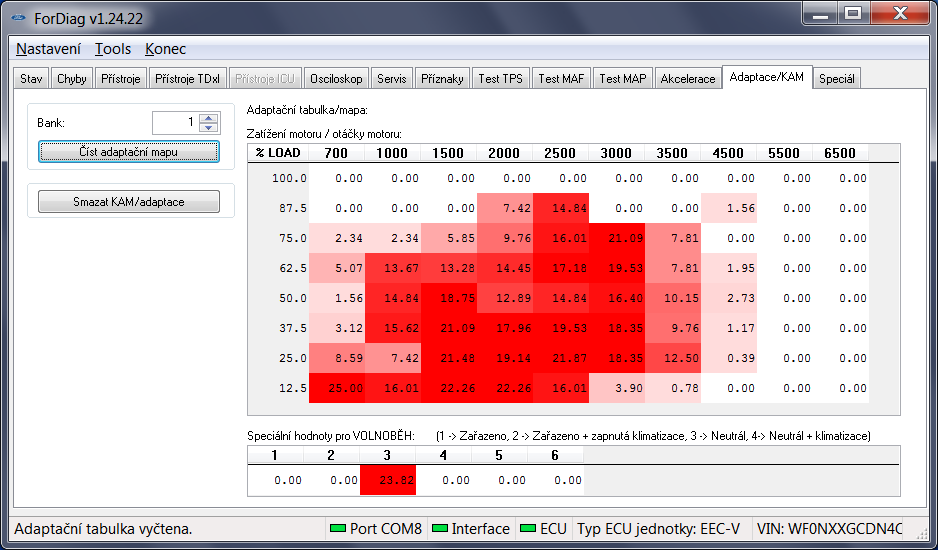 Mozna, ze neni nahoda, ze to tenkrat Pha-Bno zralo 8.1/100 a pak na zpatecni uz 8.8/100 -- ty adaptace se zrejme postupne zhorsujou a ten motor nevi, kdy ty striky prestat prodluzovat...? Po dnesnim smaznuti adaptaci zase jede trochu lip, volnobeh uz od zacatku pri jizde pekne pada na cca 900 rpm.