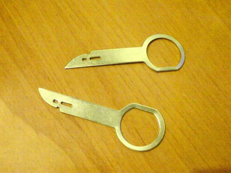 Originální "otvíráky" mají navíc i malou dírku vpředu, která slouží pro zaseknutí a vytažení radia za očka ven. Jinak na povytažení stačí třeba kreditka nebo jiná pevnější karta, kterou se to dá opatrně z boků radia vyklopit a povysunout.