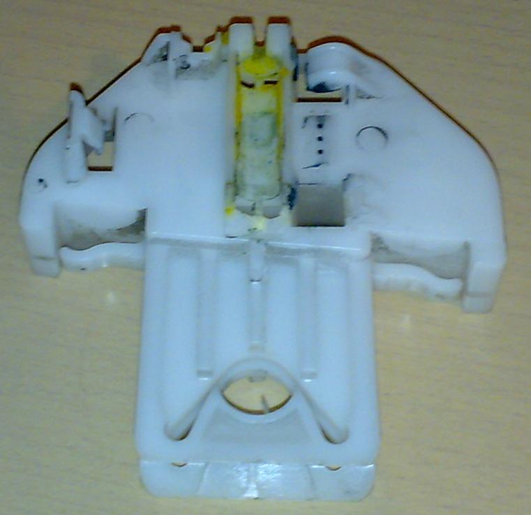 No asi jsem to měl vyfotit když byl ještě jezdec dole, ale zapomněl jsem na to a pak už se mi to nechtělo sundavat. Zkrátka jsem vše nahradil plechy, které jsem vždy přišrouboval ke stávajícímu silonu. Ten nejhlavnější plech, který drží lanko není moc vidět, ale je naohýbaný tak, aby nahradil původní silonový držák, který se ulomil a je v něm vypilovaná drážka pro lanko. Snad to bude z obrázků alespoň trochu patrné. Ještě jsem nahradil původní silonová "pérka", která mají mít funkci tlumení dojezdu, pěnovými dorazy. Ta původní péra už stejně nepružila a tím pádem tam neměla žádný význam. Vše jsem nakonec namazal pořádně vazelínou, protože všechny styčné plochy byly naprosto suché.