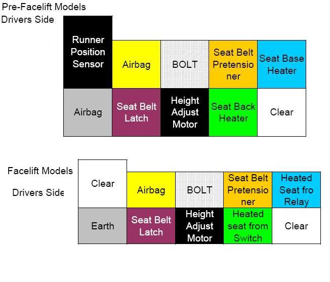 Podle schématu je silová část zelenej od plusu za relátkem do krabičky a pak červenej z krabičky do výhřevu sedáku seriově s výhřevem opěradla a zpět do krabičky černej. Bílej by měl jít od spínačů, černý s proužkama by měly být k termistoru.