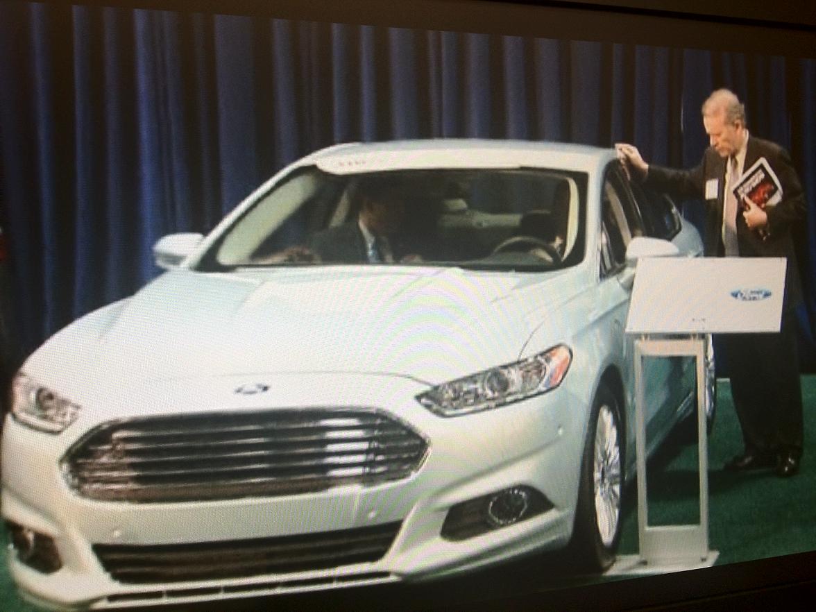 (Je to speciální pozvánka pro něho do Fordu, všude kolem v řade jsou všechny typy vozů Ford)