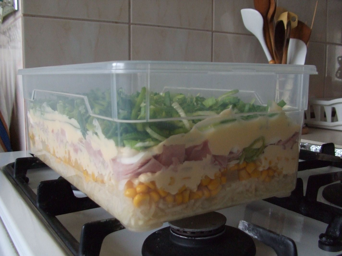 - dalsiu vrstvu tvori na štvorčeky pokrajana šunkova salama