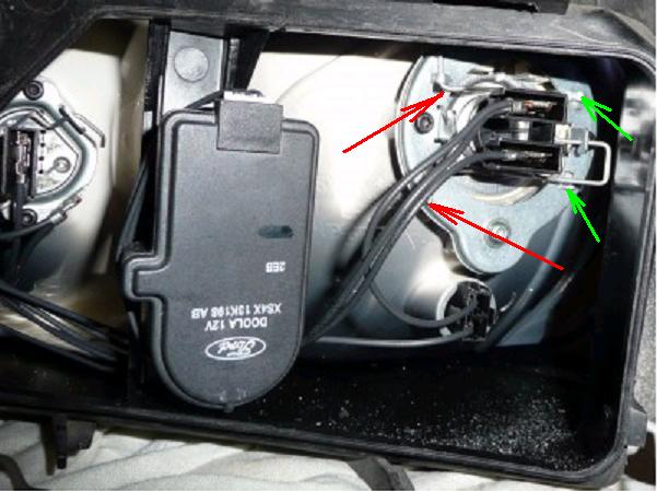 a znovu perko zasunout do prolisů označených zelenýma šipkama . Potom vložit žárovku a připojit kabeláž. Přístup k perku v místě kde se odjišťuje při výměně žárovky se podstatně zlepší .