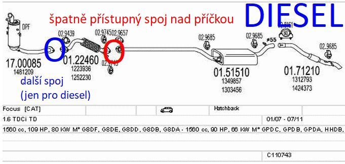 Ahoj Stano, díky za praktické komentáře. Vidím, že jsi to asi dělal na dieselovém autě, které se od mého benzinového liší v tom, že na benzinu není ten další spoj mezi DPF a vlnovcem - viz obrázky. Takže mi asi nezbývá nic jiného, než se pokusit nějakým klíčem dostat k tomu nepřístupnému spoji nad příčkou...stano. píše: 05.09.2022 14:54 Ak sa ti podari rozpojit vyfuk medzi vlnovcom a DPF, mas vyhrane. Dalsi spoj je nad spominanou prieckou, tam sa da tazko dostat s klucami, nebodaj razovym utahovakom, kvoli priecke. Potom az po koncovku vyfuku je to jeden kus.