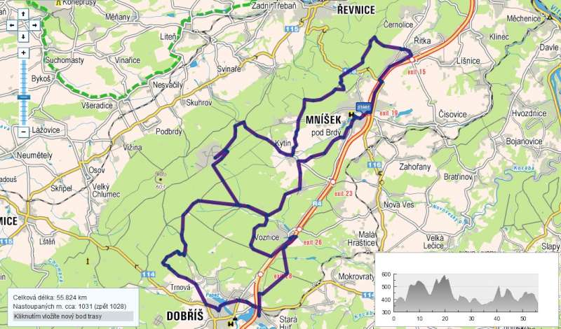 cesta vede z Mníšku na Řitku, nám známou Skalku s občerstvením, Kytín, následuje prohlídka VÚ Klondaik na hřebeni, Voznice, Stará Huť, Dobříš (buď Huť nebo Dobříš oběd), vrcholová prémie Kazatelna, pak dlouho lesem do Chouzavá a Mníšek...