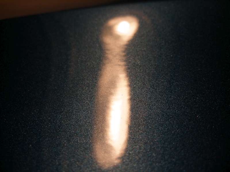 Tady jsou ty slíbené fotky laku. Na prvním jde vidět jak je lak hrbatý. Chybí mu několik vrstev bezbarvého laku - nemá žádnou hloubku. Na druhém je vidět že vyfocení odrazu světla v garáži jde udělat i na mém laku, ale obraz je zaostřen na světlo v odraze místo na lak. Taky se stativem by byly fotky mnohem kvalitnější...