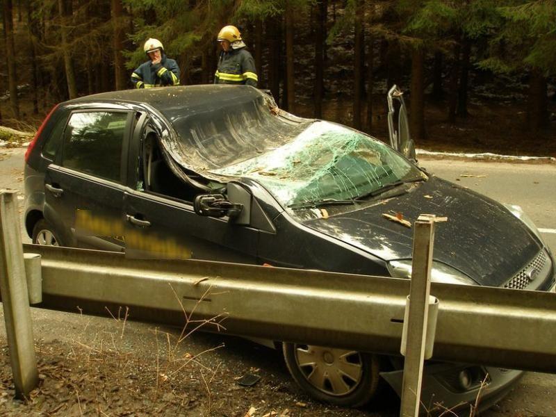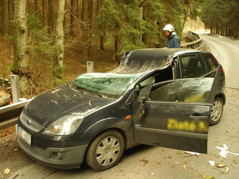 Ne bohužel měl velkou smůlu a v lesním úseku praskl mohutný strom, který spadl na právě projíždějící osobní vozidlo Ford Fiesta.