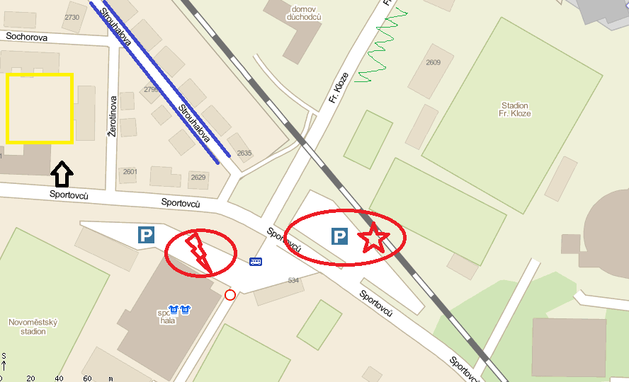 Nejlepsi bys to mel hned pred stadionem, je tam kolme parkovani k silnici (zelena vlnovka), ale tam se nejspis nechytas. Druha nejlepsi prilezitost je cervena skoro elipsa s hvezdickou, je to verejny parkoviste, zadara, uplne plny bejva leda pri fotbale, dalsi cervena skoro elipsa s "bleskem", tam se taky da zaparkovat, ale pevne doufam, ze na tohle misto uz rada nedojde, bejva plny jen lidma ze sletiste, akvaparku, co vyrazej na brusle do lesa, atd... tam bych se moc nehrnul. Posledni scenar je parkovani ve Strouhalove ulici, taky to neni daleko na stadion (cca 150m), oznacena modrejma carama. Podelne se tam parkuje po obou stranach pokud vim, ono se parkuje i v ulici Sportovcu, ale tam je plno i ve vsedni den, kor kdyz je hezky. Jeste pri very special occasions se otevira areal ve dvore bejvalejch kasaren, na mape zlutej obdelnik, vjezd je zhruba v mistech oznacenejch cernou sipkou.