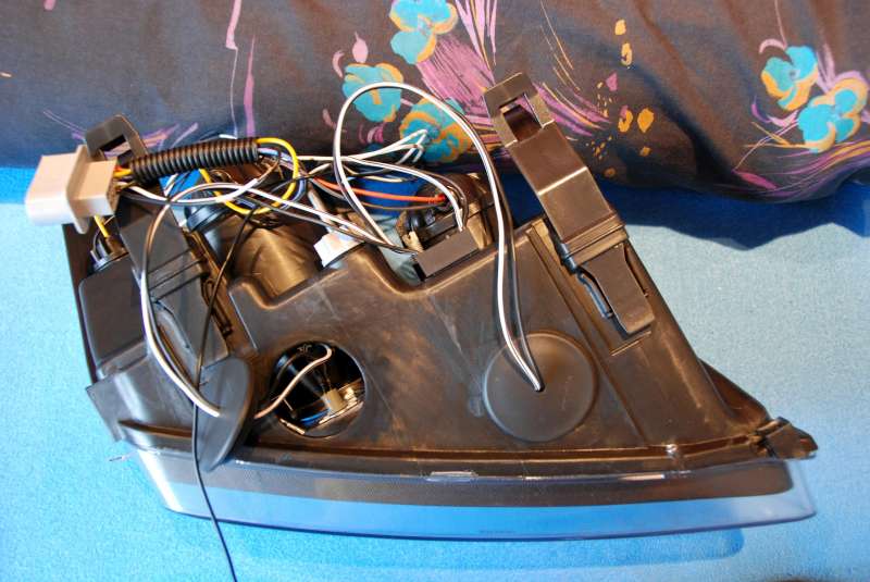 ) z posledni fotky. Sedel tam dobre, ovsem potrebuje napajeni. Vedou k nemu 3 kabliky. Hnedy -, cerny + a cerveny, ktery je pripojeny k + u potkavacky. Tak jsem vytahnul z puvodnich svetel i ten maly konektor pro napajeni motorku. Musel jsem ho ale ustrihnout (byl ve velkem original konktoru zrejme zalisovany, neslo s tim hnout) a ted je potrebuju pridat na sve misto do konektoru novych svetel. Nevite nekdo, jestli je mozne koupit zvlast ty male hranate piny, ktere jsou uvnitr konektoru??