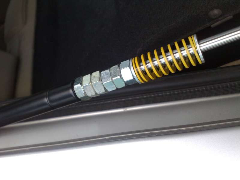 No a pak už jen nasadit pružinku a nějak to doladit. Jde jen o to, jaký kdo má ty vzpěry, protože já když koukam tou škvírkou jak to zavíram, tak i po úplném zavření ty pístky nezajedou úplně, takže jsem si změřil tu délku která tam je ještě venku a udělá se podle toho nějaká podložka ale od toho se musí odečíst ještě délka zmáčknuté pružiny. no a mělo by to fungovat. Jen tu pružinu to chce fakt silnou...
