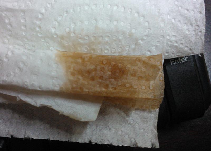 Omlouvám se za matení pojmů, ta záhadná tekutina má tuhle barvu, asi byla původně opravdu červená. Ale přes tu špinavou nádobku mi to opravdu připadalo do zelena.
