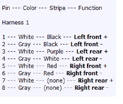 1. Nemáte niekde schému od výstupov z rádia, resp. takú, aby som vyčítal z nej, že ktorý kábel treba pripojiť na + a ktorý na - na tom reproduktore? (na starom reproduktore som nenašiel označenie a ani na konektore; podľa kábla bez schémy to tiež nieje jednoznačné jeden bol bielofialový a druhý bielo sivý alebo bielo čierny). Ak sa nič nenájde budem musieť vybrať rádio a podľa toho.