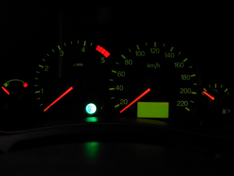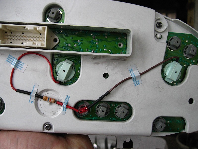 polkiboj: Kontrolka je jednoduchá bílá LED dioda s omezovacím rezistorem (žlutá - modrá - červená, 4600ohmů) zapojená paralelně k žárovkám osvětlení prístrojů.