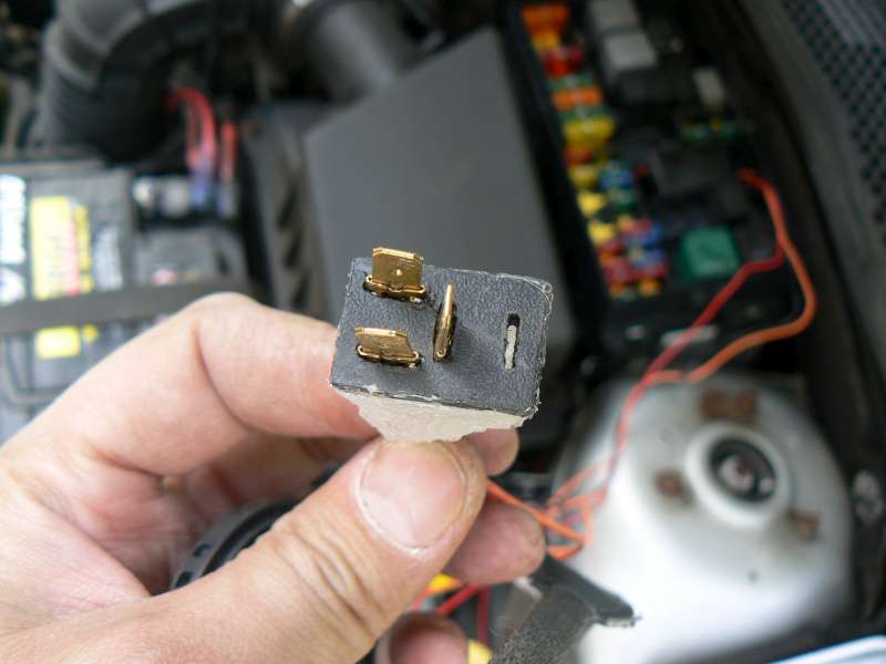 - vše zapojeno v patici pro relé denního svícení, jen ten "konektor" se musí ještě doplnit (došli náboje v tavné pistoli) a stříknout na černo :D ať to trochu vypadá