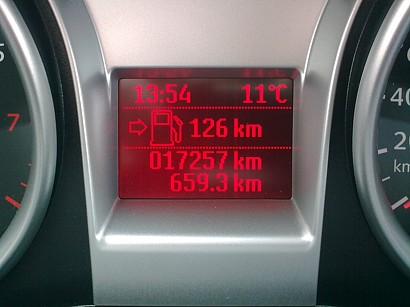 Teraz som cez víkend tankoval doplna pri dojazde 105 km a natankoval som 46 l, teda 8 litrov bolo ešte v nádrži, čo sa mi javí pri mojej spotrebe 7,2l ako reálny odhad dojazdu.