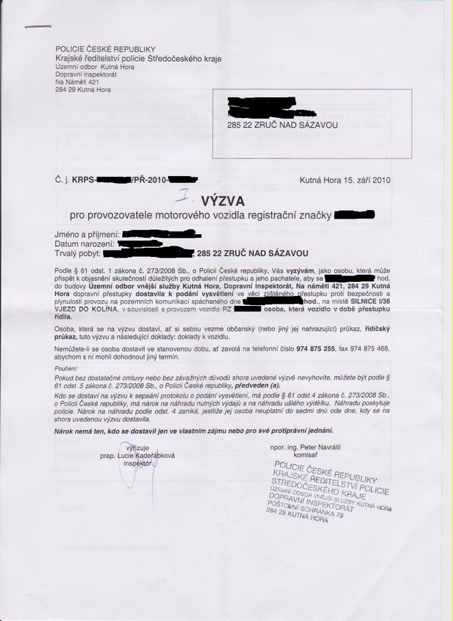 Já jezdím každý den, mám už taky naježděno několik set tisíc kilometrů a nehody se mi vyhýbaj, teď ťukám. Nelítám jako prase, není mi dvacet. Vím kde si mohu dovolit jet rychlejc, kde je to přehledný a někde zase jezdím pomaleji, než je dovoleno, když vidím, že se tam motá hodně lidí například. Přítelkyně taky s pokutou nesouhlasí, to radši koupí něco dětem. Předvolání je tady: