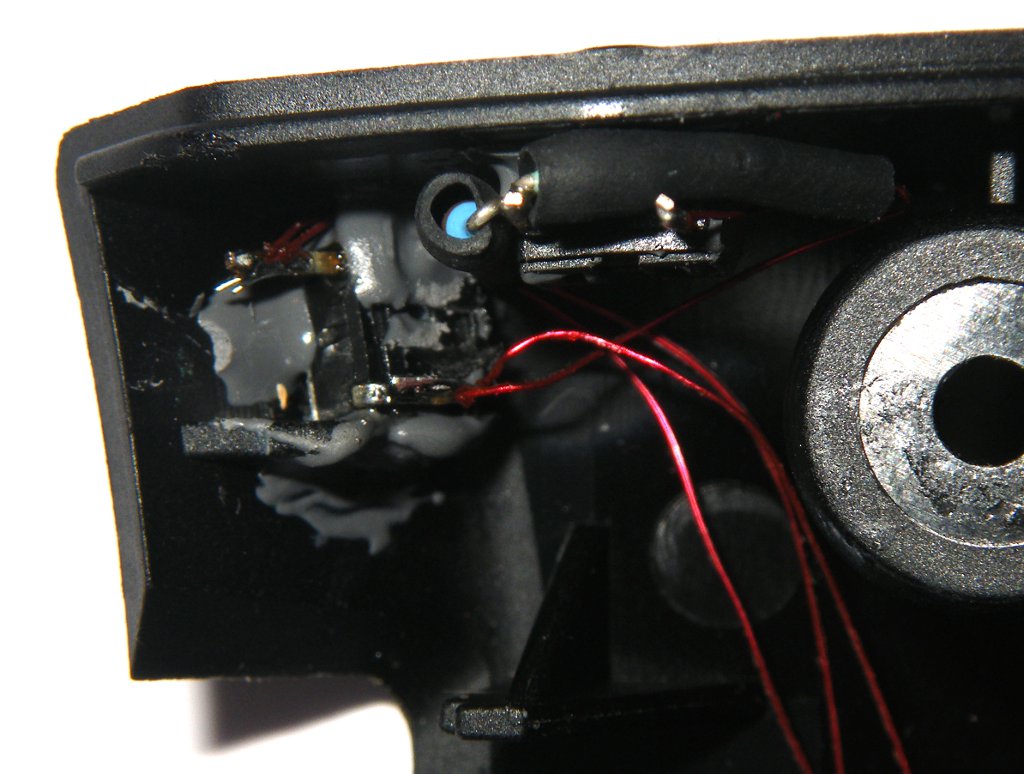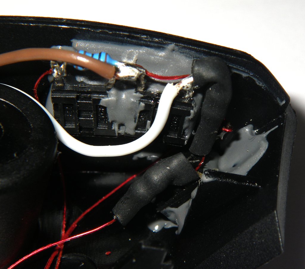 Tlačítka jsem vlepil epoxidem (měl jsem šedý). Moc to na tom plastu nedrží, ale drží to dostatečně. Propojení mám systémem vrabčího hnízda pomocí drátku z cívky (je izolovaný a je možné ho odizolovat pájkou, moc dobře se s ním dělá). Odpory jsou připájené rovnou na tlačítka a někde je to zaizolované smršťovací bužírkou.