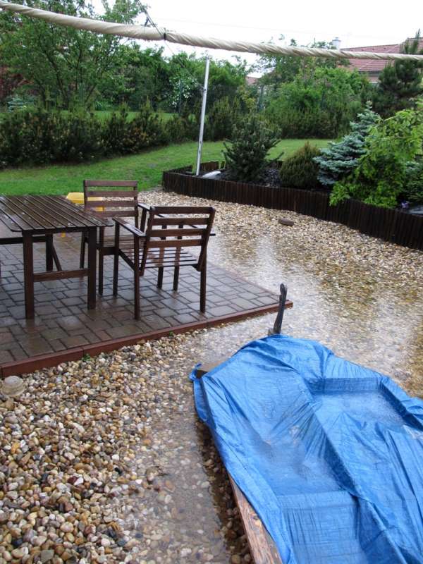 fotka z nedelniho dopoledne - na kraji terasy vede drenazni trubka do vsakovaci nadrze, ktera na 75m3 a jak vidite, tak uz neplni svoji funkci ... nastesti tam ted uz voda nestoji