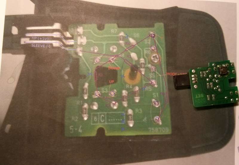 Čekal jsem, že na mě vybafne deska, které je na obrázku v pozadí, bohužel ne. Ale nějak sem se s tím popral. Použil jsem odpory podle následujícího schématu pro Pioneer. Tady už zapájené odpory a zalité lakem. Původní cestičky na plosnáku sem proškrábl tak, abych oddělil jednotlivé micro spínače od původních odporů a mezi sebou. Určitě by se to dalo vymyslet jednodušeji, ale takhle mi to funguje na 100%. Za kvalitu fotek se omlouvám, je to jen z telefonu a ještě pozdě večer...