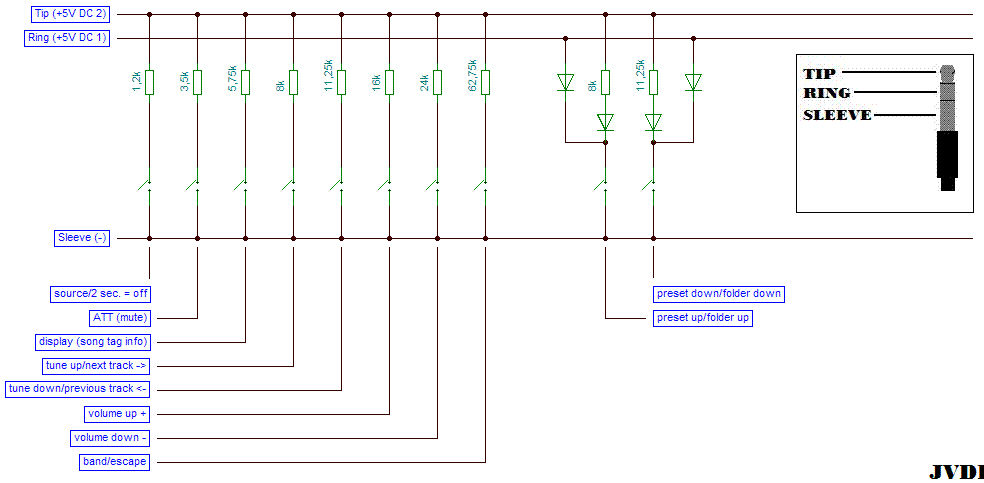 Takže pokud mi stačí 4 funkce- volume a track +/- tak stačí připájet jenom ty čtyři odpory před spínač uvedené ve schématu