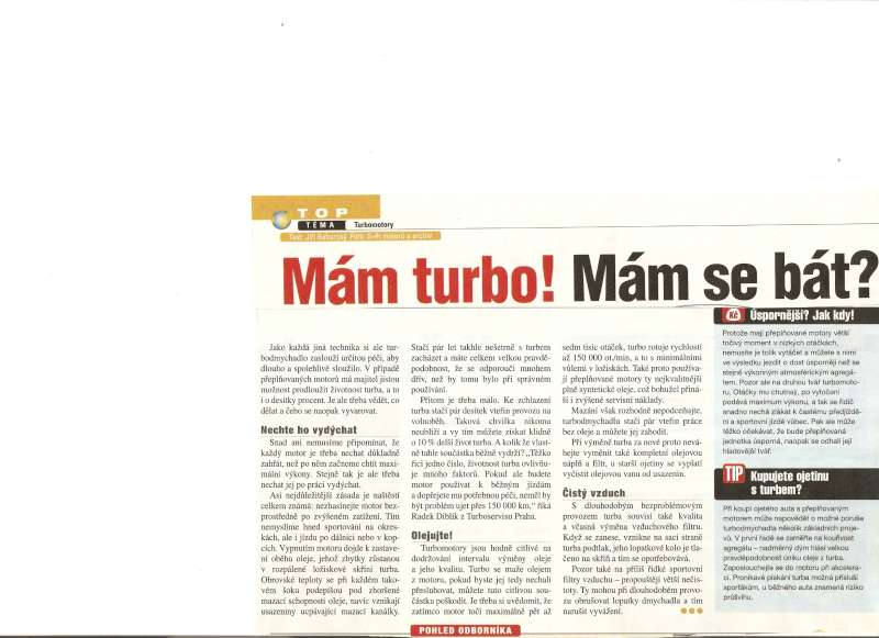 Pokud se chces bat, tak si namontuj u budik na turbo, jelikoz staci, kdyz ti za turbem povoli hadice a bude utikat vzduch, regulace tlaku pak bude spatne fungovat, pretocis turbo a ahooooj turbino (nebo sme uz i videl ze se ukroutilo ci se povolila zahadne ta maticka co drzi vrtulku a to pak rozsagrovalu vrtulku, nastesti motor byl vcas vypnut