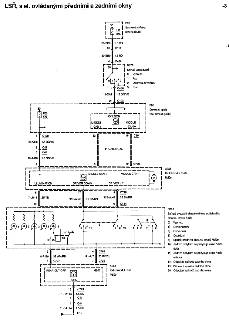 Stačí odpojit napájení oken z původního pinu 24 na konektoru C100 a zapojit ho jinam. Nejlépe do krabičky, která bude připojená přes pojistku 25A k trvalému napětí, spínanému napětí od klíčku a na kostru a jejím výstupem bude napájení pro okna, které se zapne s klíčkem ale vypne po nějaké době. Je to na jedno relé a asi šest součástek...