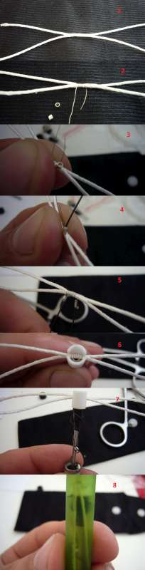 Třetí a čtvrtý obrázek ukazuje nasunutí kroužku na odporový drát (co nejvíce ke knotu) do kterého vložíme malý kousek pájky (stříhal jsem ji nůžkama) s vodičem.