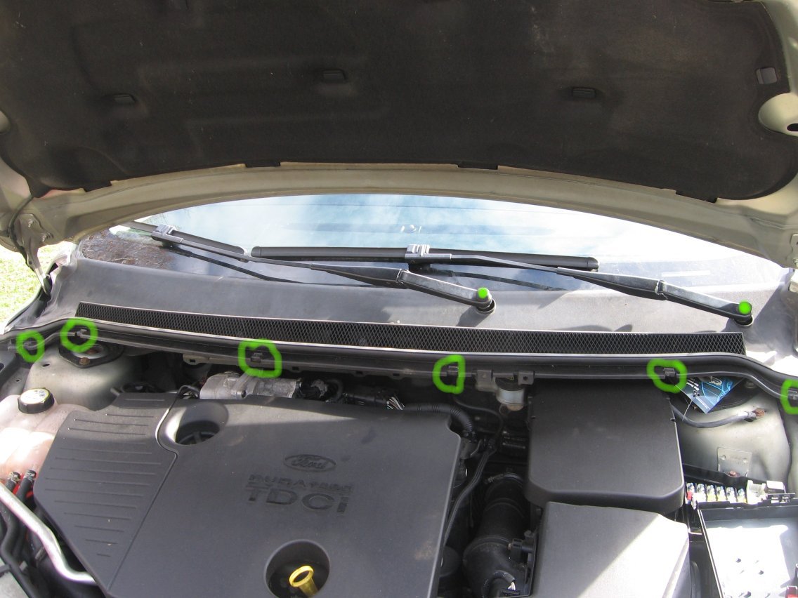 Krok první k demontáži (viz foto 1): Sundat prachovky z hřídelí stěračů (na fotce zelené tečky).