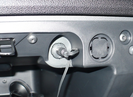 - měl jsem za kastlíkem přípravu - kabel i s konektorem, dokoupil jsem si u Forda jen váleček s jackem, udělal díru do kastlíku, nacvakl a zapojil kabel (stejně jako viz. obrázek). Problém byl - zvuk z AUXu zněl fakt divně (na předešlých stranách jsem to popisoval), jakoby z trubky a nebyl téměř nikdy slyšet zpěvák, jen hudba, a to ještě podivným způsobem.