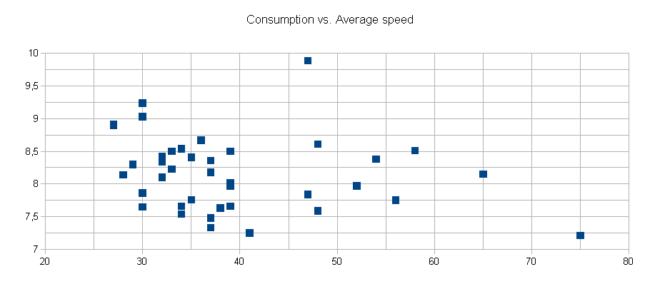 vidím tam mírnou tendenci klesání spotřeby s vyšší rychlostí, nicméně očekávám, že se trend od jisté rychlosti otočí... zkus najezdit par nádrží s průměrnou rychlostí okolo 100km/h a pak to vyhodnotíme!