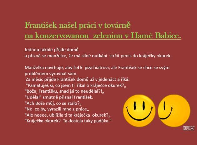 Brňák zabloudí v pražském metru. Kouká na tu ceduli s linkama metra a neleze mu to do hlavy. Tak de kolem pražák a vidí jak si brňák neví rady a povidá : " se nevyznáš v těch lajnách co? " a brňák jako že ne. Tak pražák povidá : " hele, ta červená lajna, té céčko, ta zelená té áčko a ta žlutá té béčko". A brňák kejve hlavou a povidá " a ta modrá to je déčko ? " a pražák se chytne za hlavu : " ne to je vltava ty vole…"