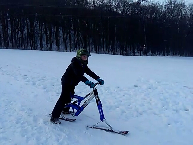 Klukovi je 12, ale svezu se na tom i já. Rám ze starýho odpruženýho kola 600,-, dětský lyže 400,- zbytek nerez plechy a spoj.materiál (z práce zbytky).