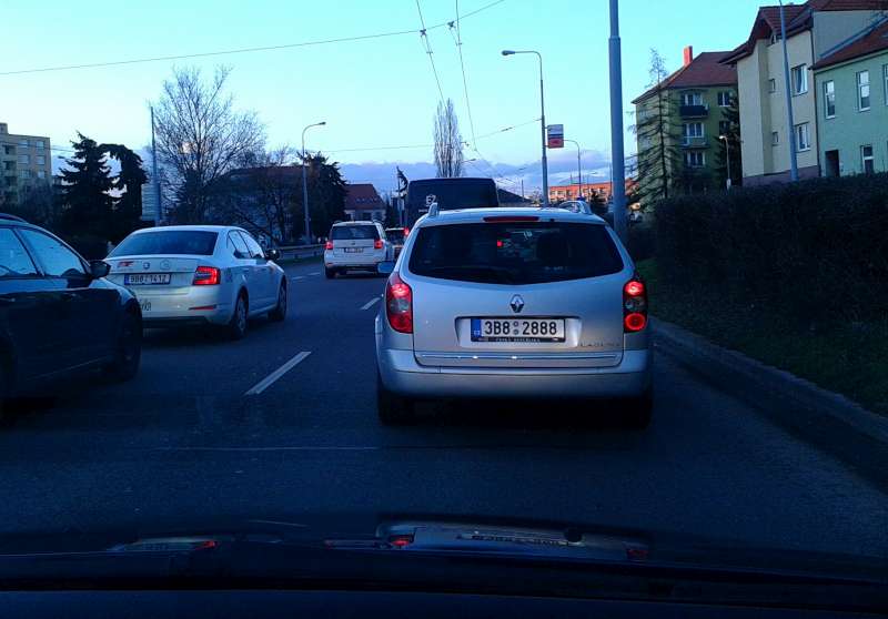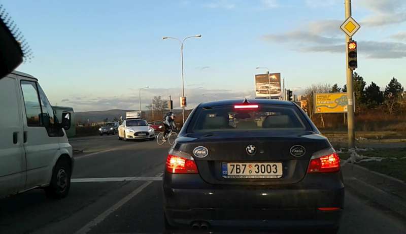 Celkem povedená křižovatka. V protisměru Tesla S s rakouskou značkou W BLITZ2, vpravo na červenou stojí fungl nová sedmička REN OCAR7 a to bávo přede mnou taky nemá úplně obyčejnou značku a o kilomatr dál rencek.