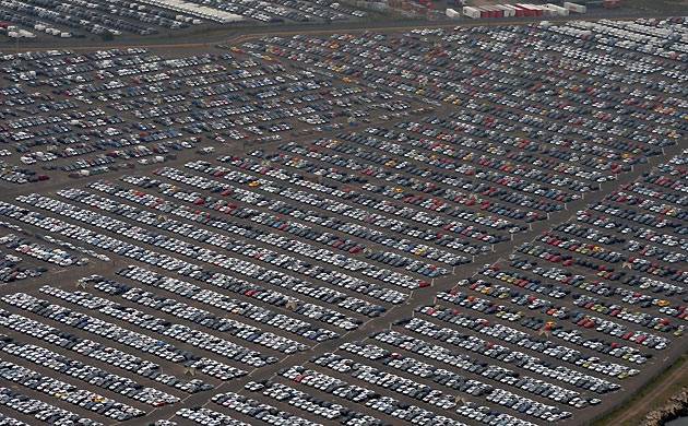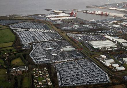 Importovane auta v otvorenom sklade v Sheernesse cakaju na dorucenie
