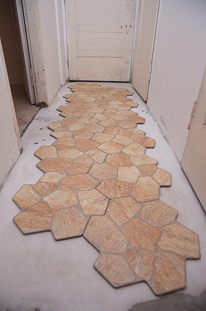 Když už jsme u toho chlubení, tak tohle je asi nejzvláštnější dlažba, co jsem zatím pokládal. Je to docela pakárna, ale výsledek se docela povedl (spárovačka je focená ještě ne úplně vyzrálá, teď už je téměř neviditelná)