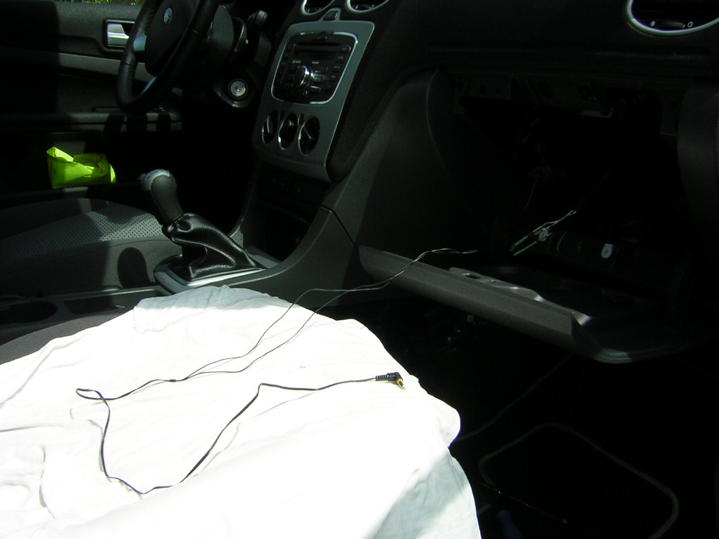 podle mě máš taky auto z DE,a tudíž máš dráty z konektoru radia vyvedené ve stejném místě jako na obr1,sundej kastlík a uvidíš konektor-zapojení je brnkačka.Pokud nedáš,tak rámeček jde sundat opetrným páčením,které jse začal vlevo nahoře,pak vpravo nahoře,potom dole,atd,atd-je tam pouze nacvaknutej,chce to trpělivost,ale jde to.Akorát se mi jeví origo vyvedení od Forda v kastlíku trochu nepraktické-já to protáhl vnitřkem palubky/místa dost/,vyndal jsem vložku popelníka/už nekouříme/a MP3 přehrávač je místo vajglů-hraje to super-stačí pustit přehrávač,na radiu zmačknout AUX/nebo pod volantem/ a už to hraje..