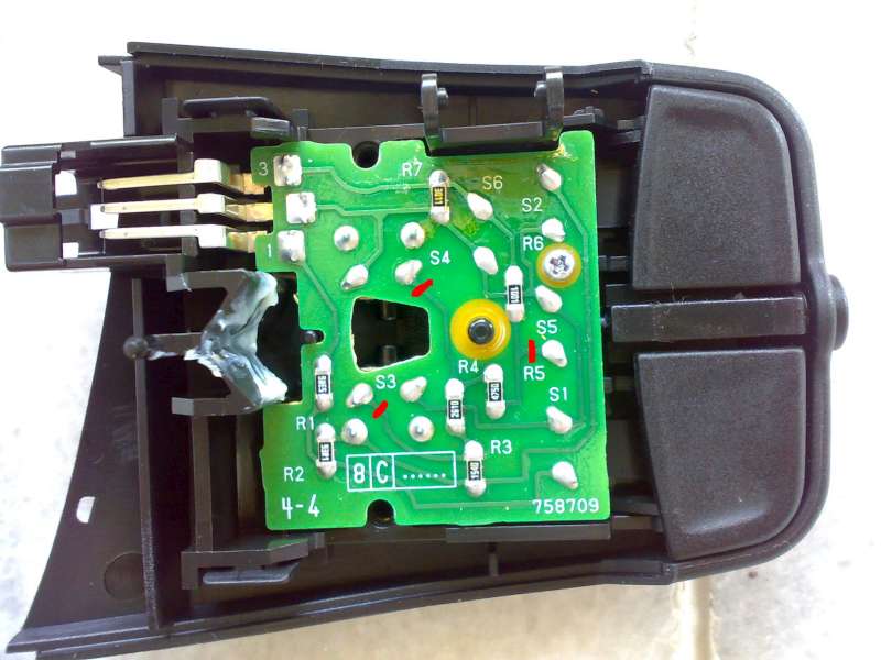 Nacházejí se tam rezistory (odpory) označené R1 až R7. Dále pak kontakty spinačů (tlačítka) označené S1 až S6.