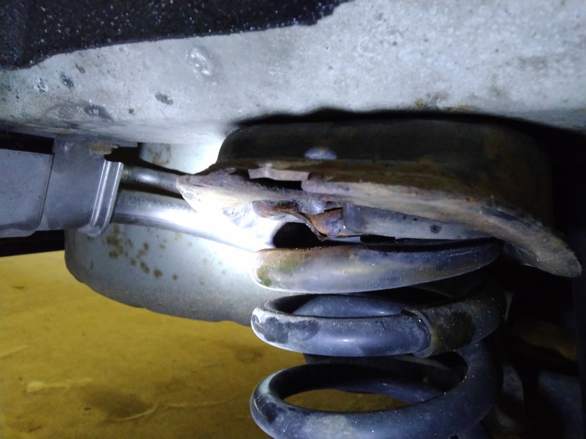 Při průjezdu zatáčkou, při přejezdu nerovností takový zvuk, jako když pneumatikou najedete na větší kámen, a on z pod ní vystřelí. A s tím spojený pocit, že ten zvuk jde od zadní nápravy a od levého zadního kola. Tak jsem sundal levé kolo, a nic jsem na pohled neobjevil. Pak jsem sundal pravé kolo, a nahoře, jak je na pružině navlečena ta PUR ochrana, tak díra a kouká z ní konec kovu. No, ulomená část pružiny. Podle lomu a koroze už to tam bylo nějakou dobu, ale zvukově se to začalo projevovat až nyní.