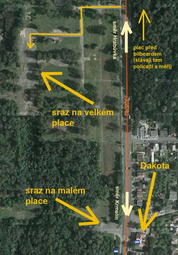 Vjezd na plochu je z Plzeňské. Naproti vjezdu stávají policajti a měří rychlost