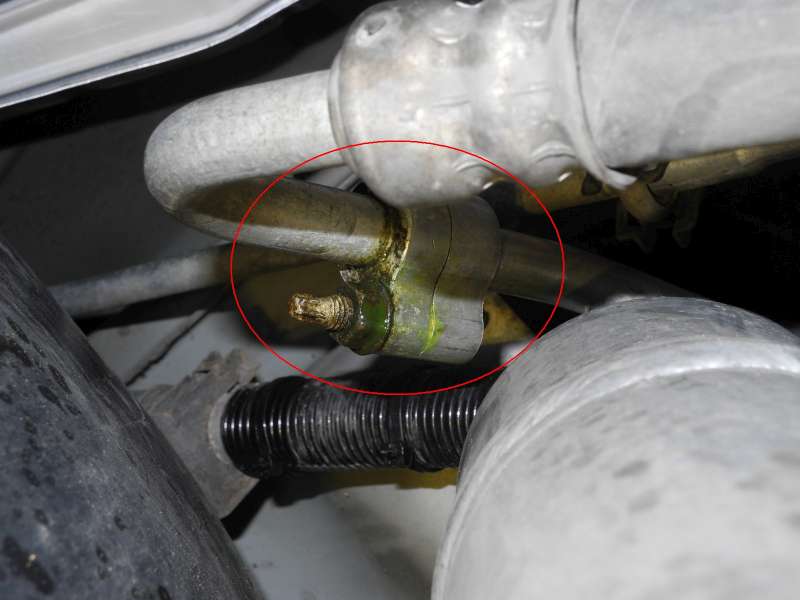 Našel jsem únik na spoji trubek z vysoušeče (foto). Únik tam nebude déle než měsíc-dva, právě i tam jsem totiž koukal, když jsem měl sundaný plastový podběh (kvůli natírání kritického místa na korozi u zástěrky). Zatím to jenom vzlíná, neodkapává, ale chci to řešit teď, asi se to bude horšit.