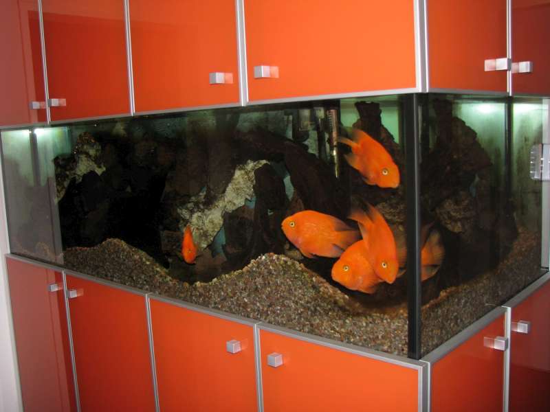 . Ta barva mě dost děsila, ale ve skutečnosti to vypadá celkem dobře. Zeptám se co bylo první, jestli rybky nebo skříň