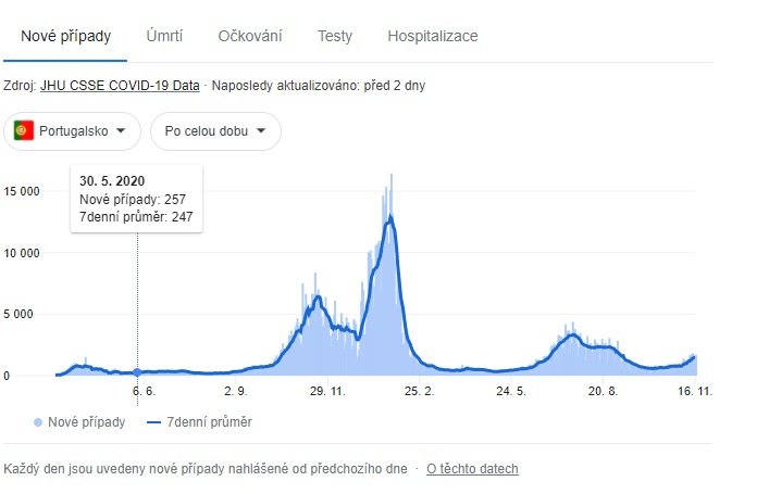 U portugalska si musíš ještě počkat. Ono u nich je výrazně tepleji takže se tam ještě vir moc nešíří - defacto loni měli zvýšený počet úmrtí až v listopadu, kdežto u nás to bylo o měsíc dřív a největší nárůst měli v lednu. Počítám, že portugalsko se začne projevovat v prosinci - defacto na grafu je jasně vidět, že případy už jim pomaličku zase narůstají... Edit: ještě dodám, že úmrtí narůstají cca měsíc po nárůstu nakažených.fofok píše: 17.11.2021 17:28 A co pak v takovým Portugalsku, když tam je 98% zaočkovanost dospělý populacekdo tam Miki umírá teda a jak to je teda s tou účinností?