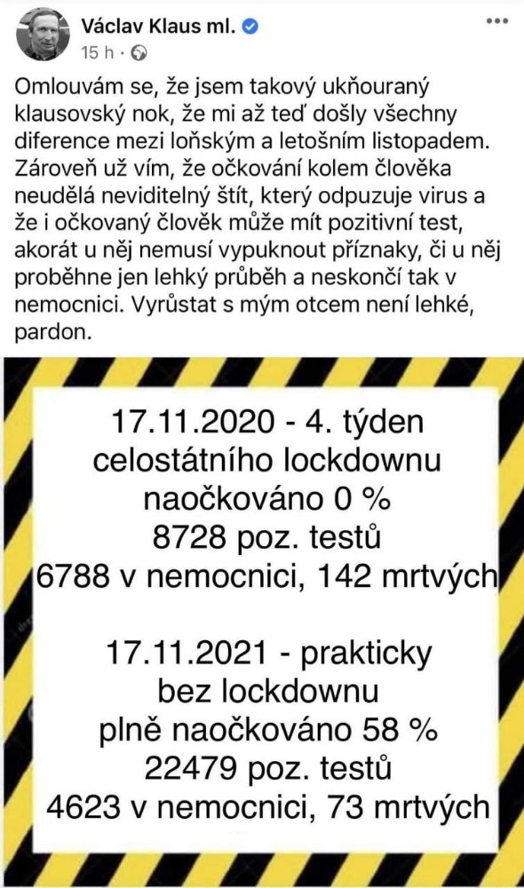 V podstatě je to přesně tak.miki21 píše: 21.11.2021 19:54 No spíš bych to viděl tak, že i pokud by bylo očkování proti c19 povinné, tak než se naočkují ti poslední, tak ti první se už, vzhledem ke klesajícímu účinku, nakazí a točíme se ve stejném kruhu. Navíc je dost pravděpodobné, že časem nějaká ta mutace očkování obejde. Takže opět vlna a opět kruh.