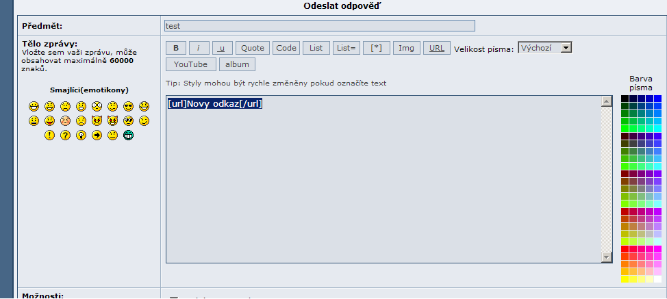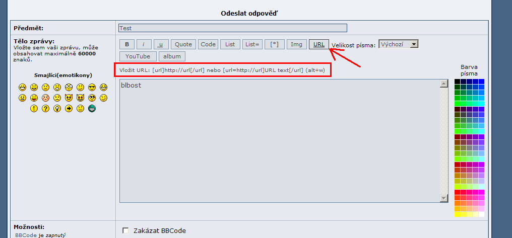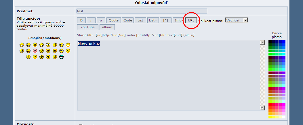 [1] pri psani zpravy oznacime text, ktery chceme pak videt jako odkaz a klikneme na tlacitko URL [2] vysledek bude potom asi takovy: [3] musime jeste zadat adresu, kam odkaz ma smerovat, tu vlozime za rovnitko (znak =) [4] muzeme se podivat na to, jak prispevek bude vypadat zmacknutim tlacitka Nahled [5] pokud je vse OK, prispevek odesleme tlacitkem Odeslat