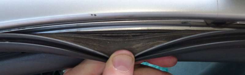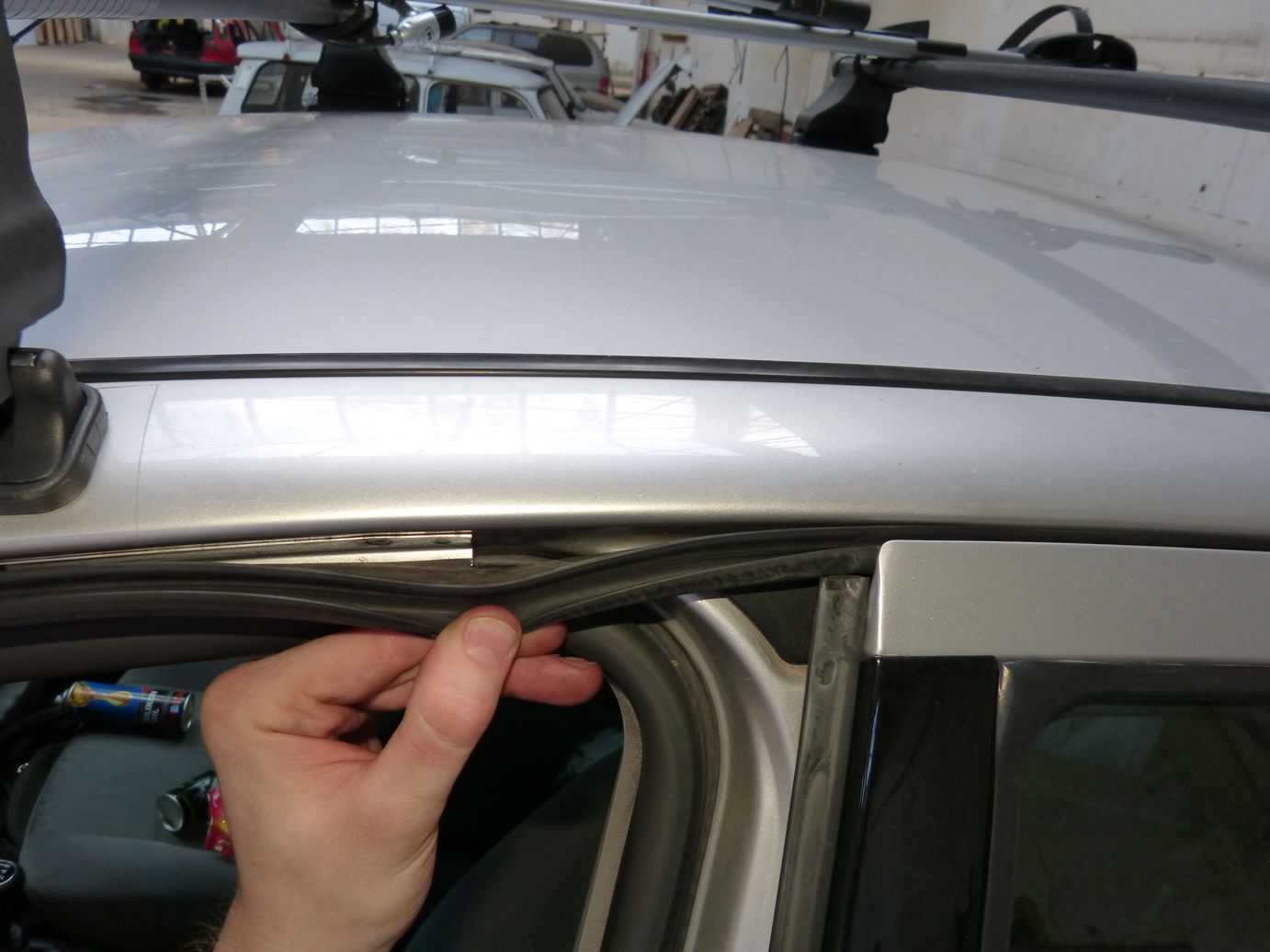 Stiahni okno, otvor dvere, daj stehno medzi dvere a B-stlpik, a lavo rukou zatlac do toho rohu, aby si trosku zohol dvere. A tu vrchnu gumu poriadne dotlac, aby zapadla do drazky. Presne pod tym miestom, ako sa leskne blesk na hrane strechy.