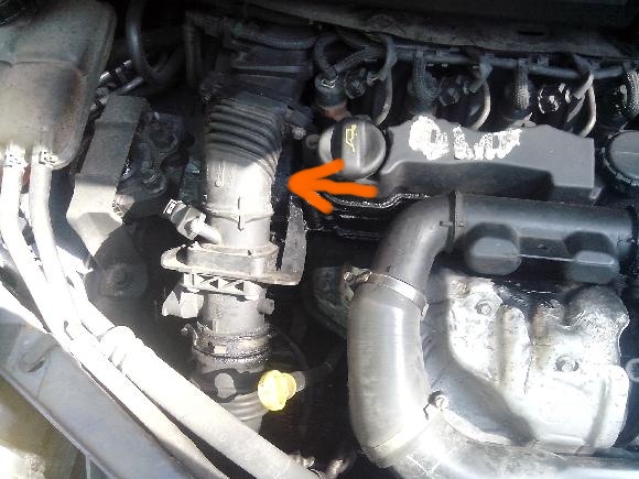 Ahoj.Vlastním Ford focus C-max 2005 1.6 TDCi 1560ccm/80kW/109HP. Začalo mi černě kouřit z výfuku při vyšších otáčkách a občas ztratím výkon. Při otevření kapoty jsem zjistil,že je motor zprasený a manžeta označená na obr je prasklá:Může to být tím? Co je to vlastně za manžetu a vyměním si jí sám? děkuji za odpovědi
