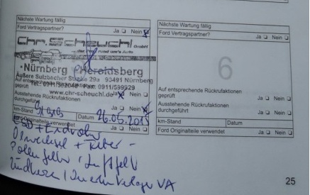 Ahoj kluci, uměl by mi prosím někdo znalý rozluštit německý zápis v servisní knížce? Polovinu jsem rozluštil, polovinu ne (1. a 4. řádek). O několika věcech co byly na autě dělané vím, ale jestli o všech je nejisté