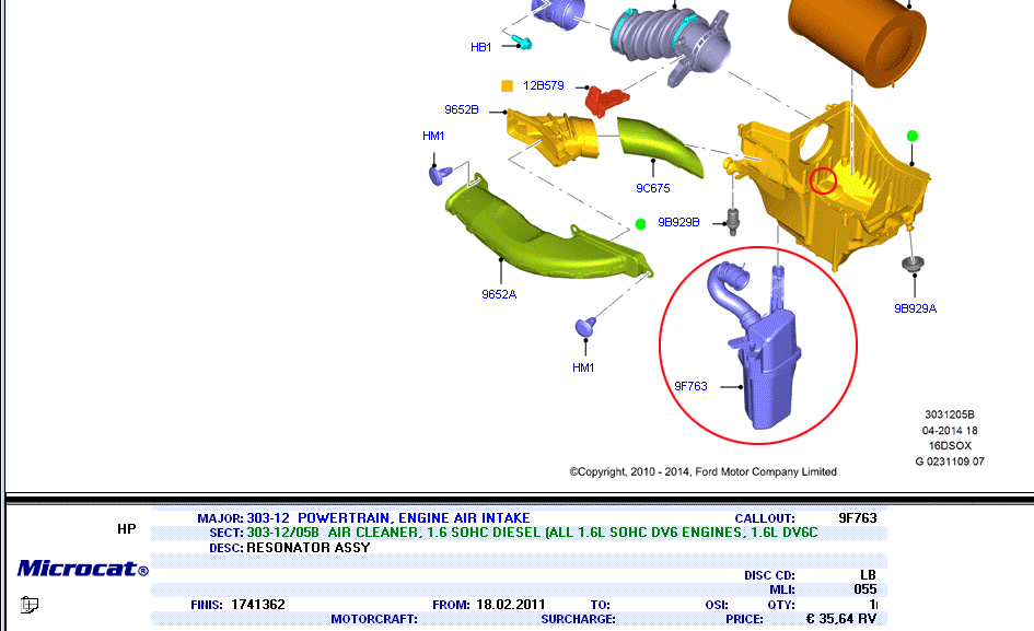 V katalogu jsem dohledal, že tam chybí určitě položka "REZONÁTOR sání" finis 1741362 (modrá věc zakroužkováno červeně) a to jsem si už koupil. Bohužel to ale zdaleka nebude všechno...hadice z rezonátoru nelze do díry upevnit (díra samotná není v katalogu na obrázku ani vidět - zakroužkoval jsem), evidentě tam musí být ještě nějaka přechodová plastová redukce. Bohužel i samotný rezonátor netuším k čemu má být fyzicky upevněno jeho tříbodové upevnění...asi mi tam opět schází nějaký držák? V katalogu neumím dohledat..nevidím